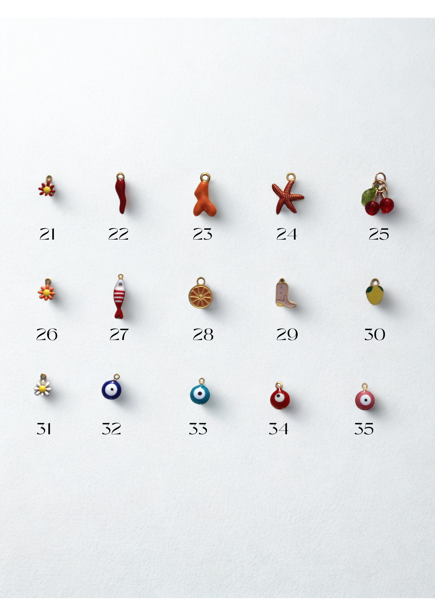 Choisissez votre chaîne, votre nombre de charms puis, inscrivez les numéros des breloques que vous souhaitez dans l'ordre de votre choix